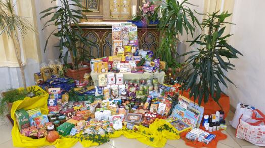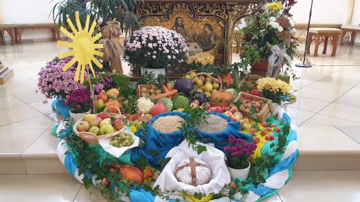Im anschliessenden Familiengottesdienst, den ein Team um Gemeindereferent Johannes Tauer vorbereitet hatte, bot sich für die Kindergartenkinder mehrfach die Möglichkeit, den Gottesdienst mitzugestalten, sei es in einem Lied oder einem Tanz. Pfarrer Arul wies auch auf den alten Brauch hin, frisches Brot vor dem Anschnitt mit Kreuzzeichen zu versehen. Das geschehe, um Segen zu erbitten und um Danke zu sagen. Die Pfarrgemeinde hatte wieder mit Sachspenden zur Gestaltung eines Erntealtars beigetragen. Die Lebensmittel werden, wie bereits seit vielen Jahren, der Amberger Tafel zur Verfügung gestellt, um diese an Bedürftige zu verteilen. Die Aktion, die Gaben des Erntealtars an die Tafel weiterzuleiten, hatte damals in Herz Jesu seinen Anfang genommen und erfreut sich wachsender Beliebtheit.