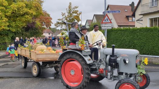 Wie in den meisten Gemeinden feierte die Pfarrei Herz Jesu Rosenberg am 2. Oktober sein Erntedankfest. Pfarrgemeinderat und Ministranten hatten Erntealtäre sowie einen Erntewagen vorbereitet. In einem Kirchenzug vom Kettelerhaus bis zur Pfarrkirche reihten sich viele Kindergartenkinder mit deren Eltern ein. Der Erntewagen wurde von einem stilvoll hergerichteten Oldtimertraktor gezogen, den Georg Übler lenkte. Pfarrer Arul ließ es sich nicht nehmen, auf dem Traktor Platz zu nehmen und somit die Prozession von gehobener Position aus zu begleiten.