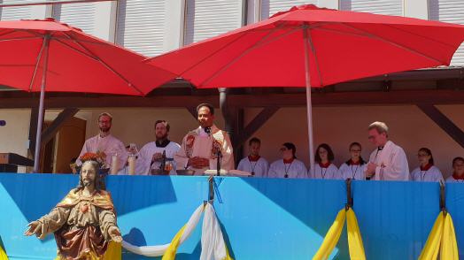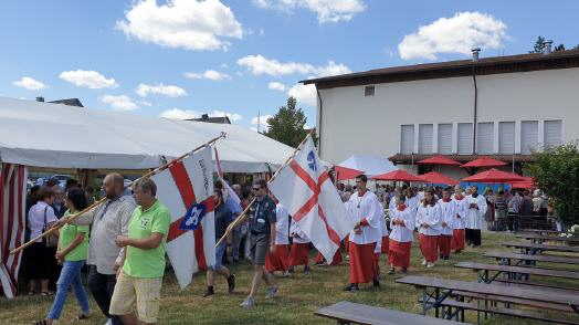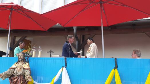 „Die Ernte ist groß, aber der Arbeiter sind wenige“, mit diesen Worten aus dem Lukasevangelium begrüßte Pfarrer Saju zum Beginn des Festgottesdienstes auf der Wiese des Rosenberger Kettelerhauses die zahlreichen Gottesdienstbesucher und Gäste.