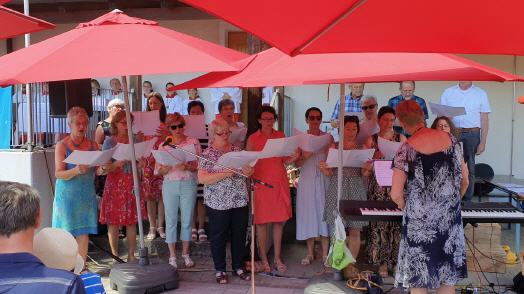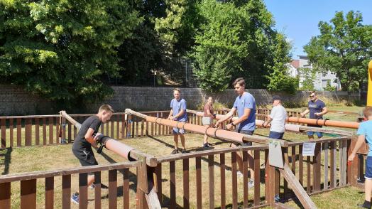 An den Gottesdienst schloss sich ein gemeinsames Mittagessen an. Am Nachmittag war wieder ein Festprogramm in bewährter Weise angesagt. Neben der Verpflegung durch Kaffee und Kuchen, Bratwürsten und kühlen Getränken hatte es wieder Kinderbelustigungen wie Hüpfburg, Schminken oder Rosenburgschiessen gegeben. Aber auch der Menschenkicker durfte nicht fehlen.