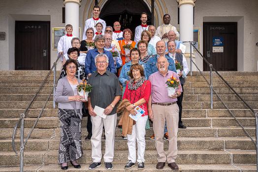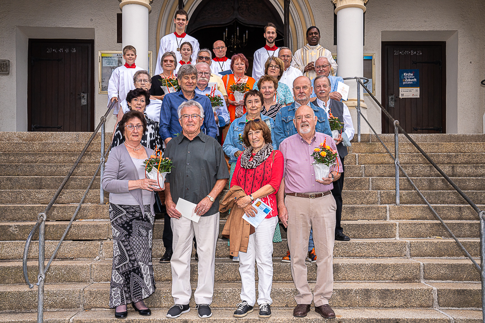 Auch in diesem Jahr lud die katholische Pfarrei Herz Jesu Rosenberg ihre diesjährigen Ehejubilare zu einem festlichen Gottesdienst und einer kleinen Ehrung ein. Neun Paare waren der Einladung von Pfarrer Donald gefolgt, um am 14. Juli in der Pfarrkirche einen Festgottesdienst zu feiern. Pfarrer Donald erinnerte in seiner Predigt an das Auf und Ab heller und trüber Tage, an eine bunte Folge von Erwartungen und Erfüllungen, von Freude und wahrlich auch von mancherlei Sorge und Leid, das die Jubilare in den vielen gemeinsamen Jahren durchstanden hätten. Meistens sei es ja so, dass beim Rückblick in die Vergangenheit das Unerfreuliche verblasse und die dankbare Freude überwiege. So wünschte er den Jubilaren, die auf 25, 40, 50 oder sogar 55 gemeinsame Ehejahre zurückblicken konnten, dieser Freude Raum zu geben.