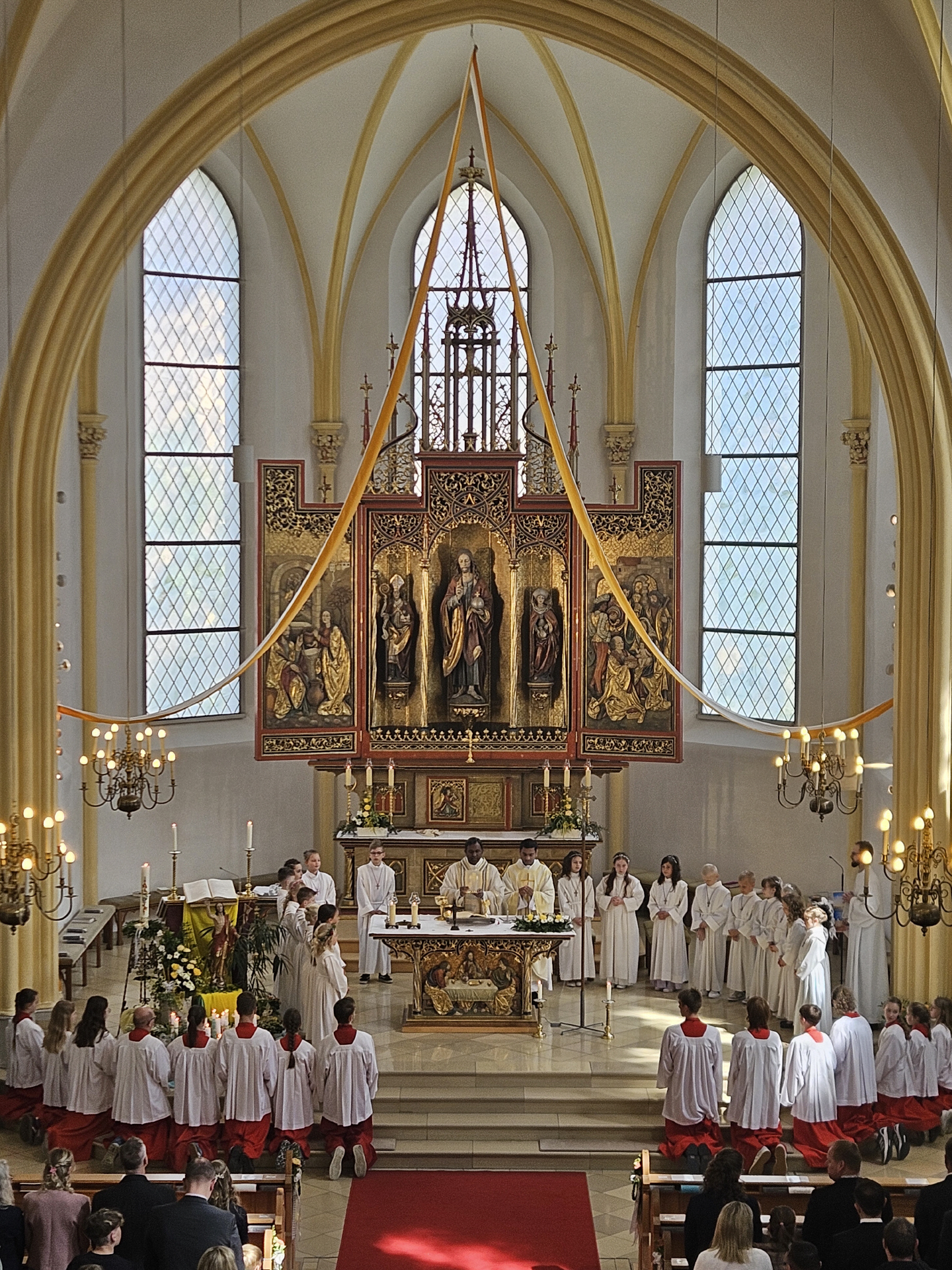 Bei einem Dankgottesdienst am gestrigen Montag trafen sich die Erstkommunionkinder nochmal mit ihren Eltern und Paten in der Kirche. Hier wurden auch die Andachtsgegenstände gesegnet und die Geschenke der Pfarrei an die Erstkommunionkinder überreicht. Pfarrer Dr. Donald dankte allen, die in der Vorbereitung mitgewirkt hatten, besonders den Eltern, die in diesen Zeiten sehr gefordert waren und es auch weiterhin sind.