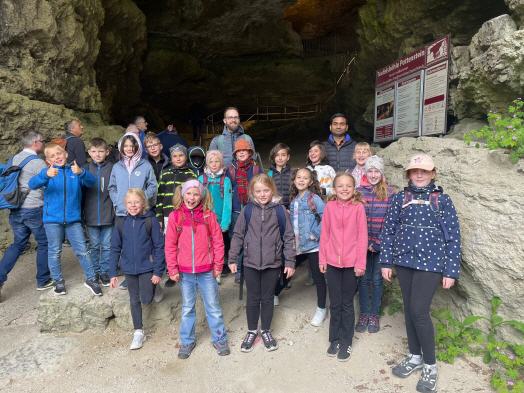 Nach dem Dankgottesdienst unternahm die Gruppe der Kommunionkinder und Eltern sowie Großeltern einen Ausflug unter der Leitung von Gemeindereferent Johannes Tauer in die Fränkische Schweiz: Nach einem Zwischenstopp in der Asamkirche St. Johannes in Michelfeld – Auerbach und einer Kirchenführung für die Kinder ging es nach dem Mittagessen im Gasthaus Schindler weiter zu einer Führung in der Tropfsteinhöhle „Teufelshöhle“ in Pottenstein. Bevor es mit dem Bus wieder nach Hause ging, durften sich die Kinder noch auf der Sommerrodelbahn austoben und ein paar schnelle Runden drehen.