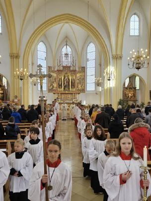 Auch durfte den acht Kindern, die im letzten Jahr in die Gemeinschaft aufgenommen worden waren, nach einjährigem fleißig ausgeführten Dienst jeweils eine Bronzeplakette überreicht werden. Gemeindereferent Johannes Tauer sowie Pfarrvikar Jestin freuten sich über die große Schar der an dem feierlichen Gottesdienst teilnehmenden Ministranten und bedankten sich für die vielen Einsätze im Laufe des Jahres. Das liturgische Thema des Gottesdienstes war das Bild des Menschenfischers, wonach alle mit Jesus in einem Boot sitzen und seinen Idealen folgen.
