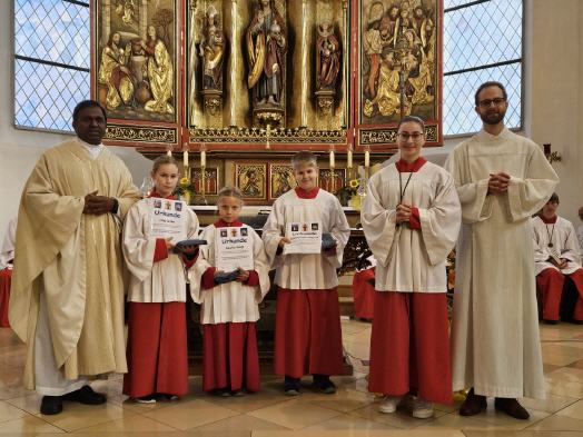 Doch nicht nur die neu Aufgenommenen Lina Jeske, Sophie Weiß und Maximilian Lippert standen im Mittelpunkt, auch die sechs Ministranten, die im letzten Jahr in die Ministrantengemeinschaft aufgenommen worden waren, erhielten nach einem Jahr Zugehörigkeit ihre Bronzeplaketten mit dem Pfingstereignis und der Aufschrift: "Wer mir dienen will, folge mir nach". So gratulierten Pfarrer Donald, Gemeindereferent Tauer sowie die Oberministranten Elias und Hanna Beer zum treuen und fleißigen einjährigen Dienst: Roland Gubicz, Kilian Hofmann, Jeremia Brandhuber, Jakob Brandhuber, Theo Sommer und Paula Güthe.