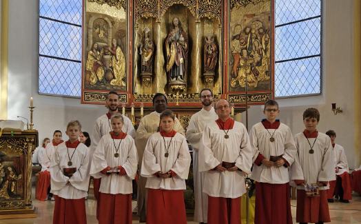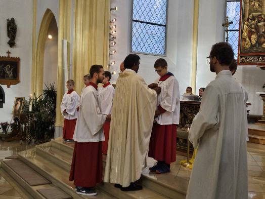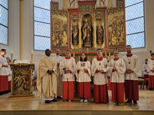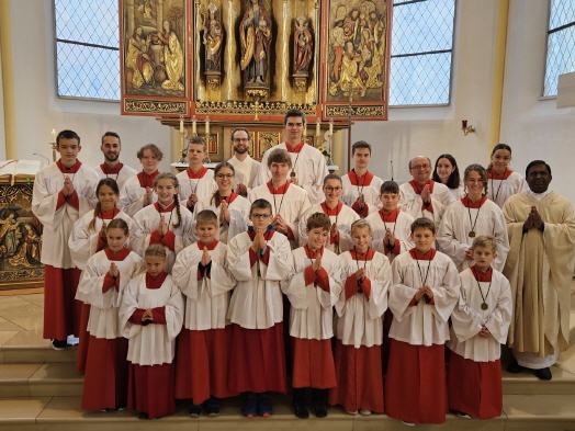 Üblicherweise steigen die Kinder nach ihrer Erstkommunion in den Altardienst ein, wobei auch ‚Späteinsteiger‘ aus älteren Jahrgängen jederzeit willkommen sind. Pfarrer und Gemeindereferent zeigten sich sehr dankbar und stolz, dass die Pfarrei jetzt 40 Minis hat.