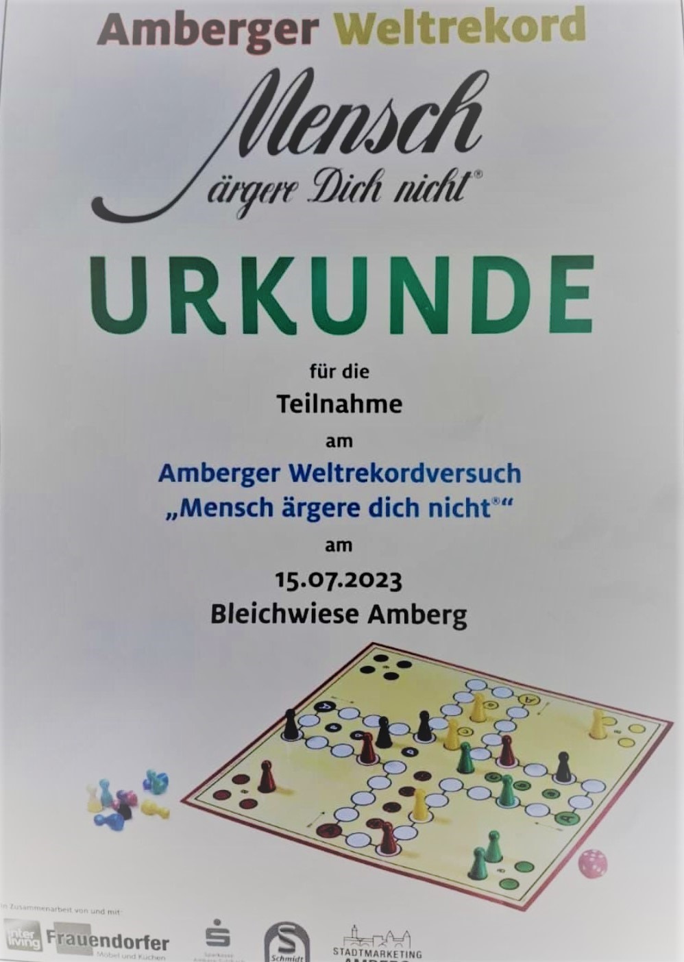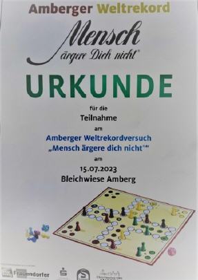 Nach erfolgreicher Registrierung, Platzsuche und Spiel, wurde der Weltrekord offiziell bestätigt und ist nun wieder in der Heimatstadt des Erfinders Josef Friedrich Schmidt in Amberg Zuhause. Zwischenzeitlich war der 2017 aufgestellte Weltrekord der Amberger mit 2009 spielenden Menschen in die Stadt Weida nach Thüringen gegangen.