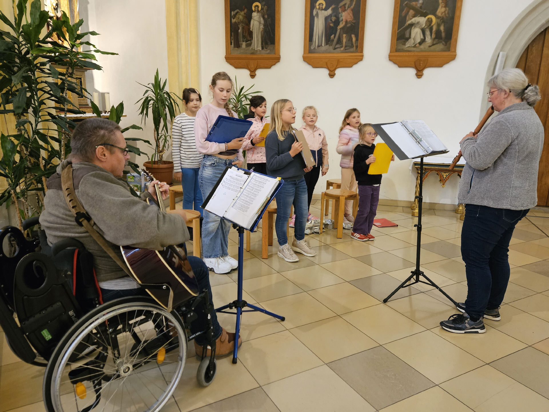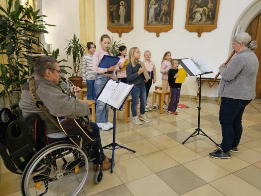 Wir singen traditionelle Lieder aus dem Gotteslob, greifen aber auch gerne zu neuem geistlichen Liedgut, welches Kinder anspricht und berührt. Bei uns sind alle Kinder ab der 3. Klasse herzlich willkommen – zum Singen, aber auch mit Instrumenten wie Gitarre, Flöte, Keyboard, Piano oder Schlagzeug.