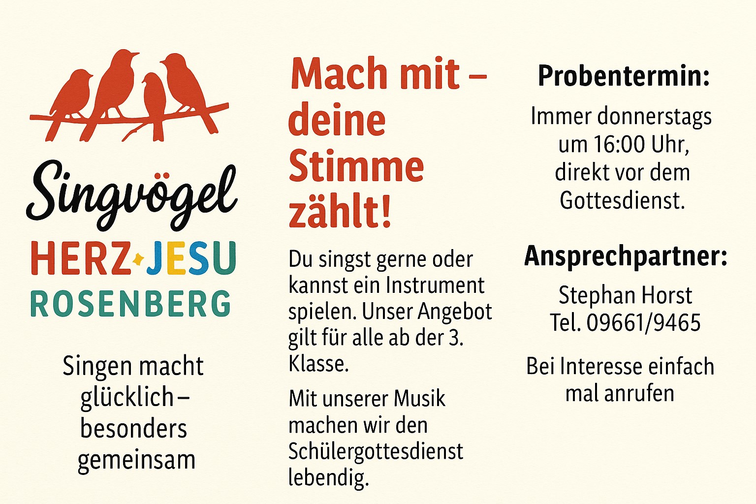 Seit 2011 gibt es uns – die Singvögel Herz-Jesu Rosenberg. Unsere Kindermusikgruppe wurde ins Leben gerufen, um die Schülermessen musikalisch lebendig, kindgerecht und mit viel Freude am Glauben zu gestalten.
